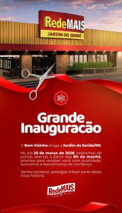 Jardim do Seridó Jardim do Seridó vive um novo momento A cidade já está em contagem regressiva para a grande inauguração do supermercado Rede Mais – Jardim do Seridó, que acontece no próximo dia 25 Leia mais... 19/03/2026 Nenhum comentário